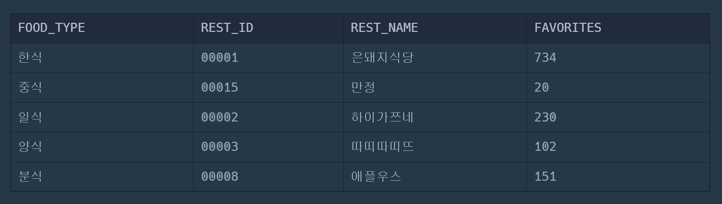 | [SQL] (프로그래머스/MySQL/Level 3)_즐겨찾기가 가장 많은 식당 정보 출력하기 (0) | 2024.01.26 |