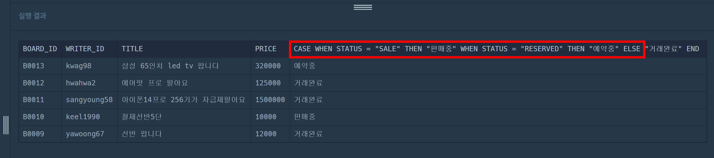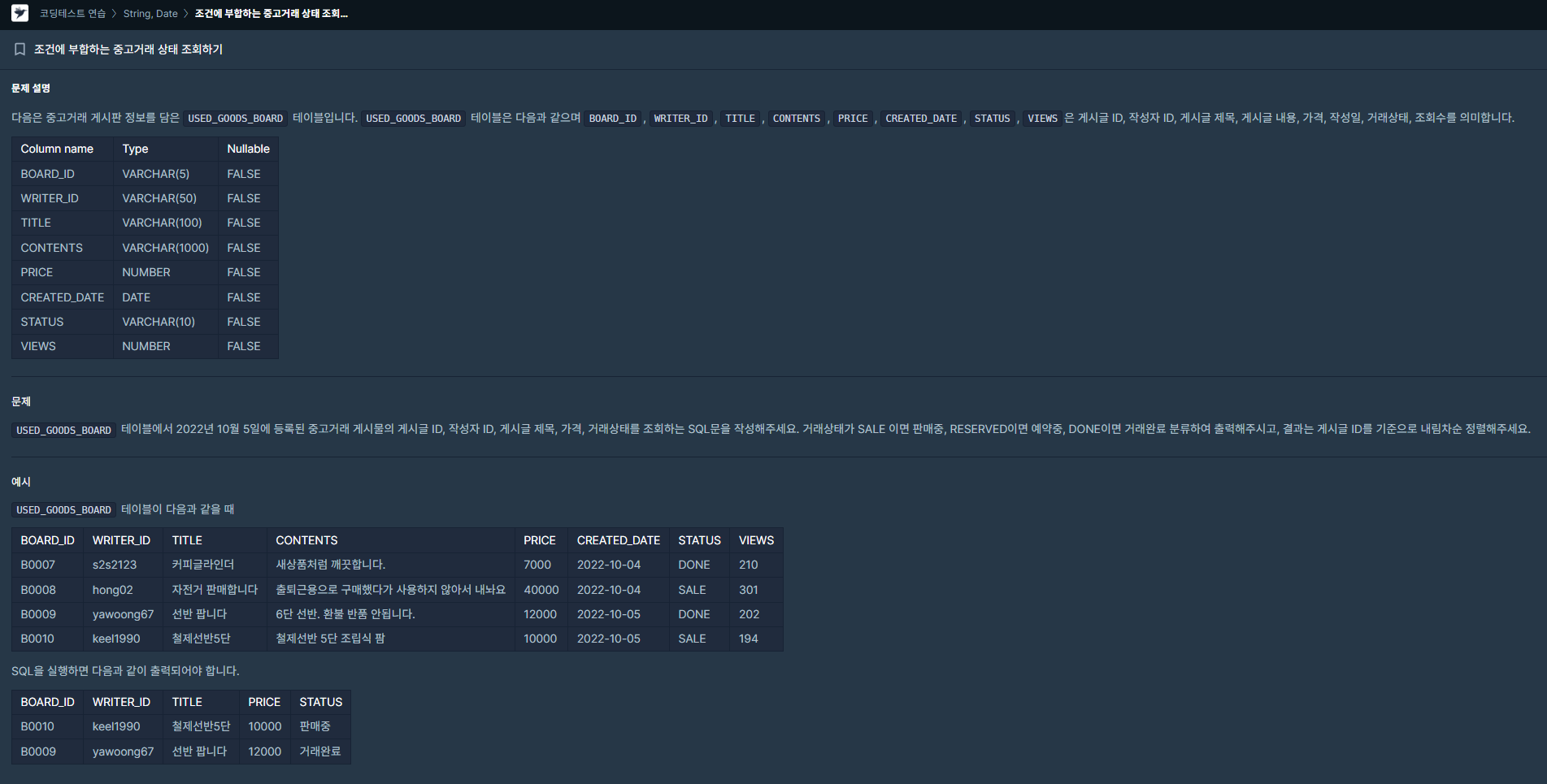 | [SQL] (프로그래머스/MySQL/Level 2)_ 조건에 부합하는 중고거래 상태 조회하기 (0) | 2024.02.04 |