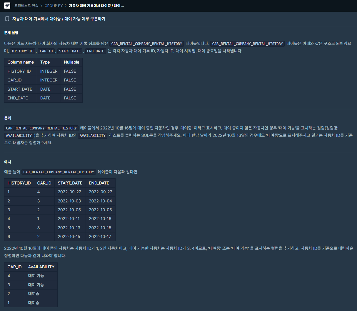 | [SQL] (프로그래머스/MySQL/Level 3)_자동차 대여 기록에서 대여중 / 대여 가능 여부 구분하기 (0) | 2024.01.28 |