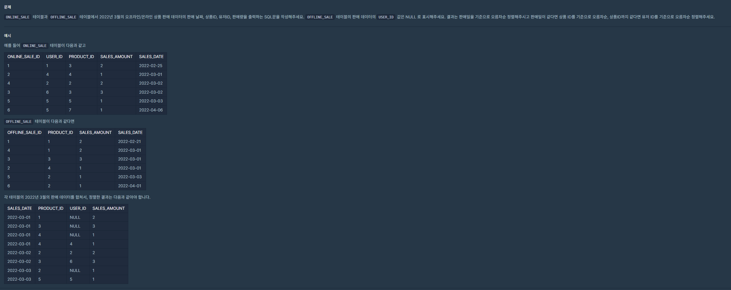 | [SQL] (프로그래머스/MySQL/Level 4)_오프라인/온라인 판매 데이터 통합하기 (0) | 2024.01.22 |
